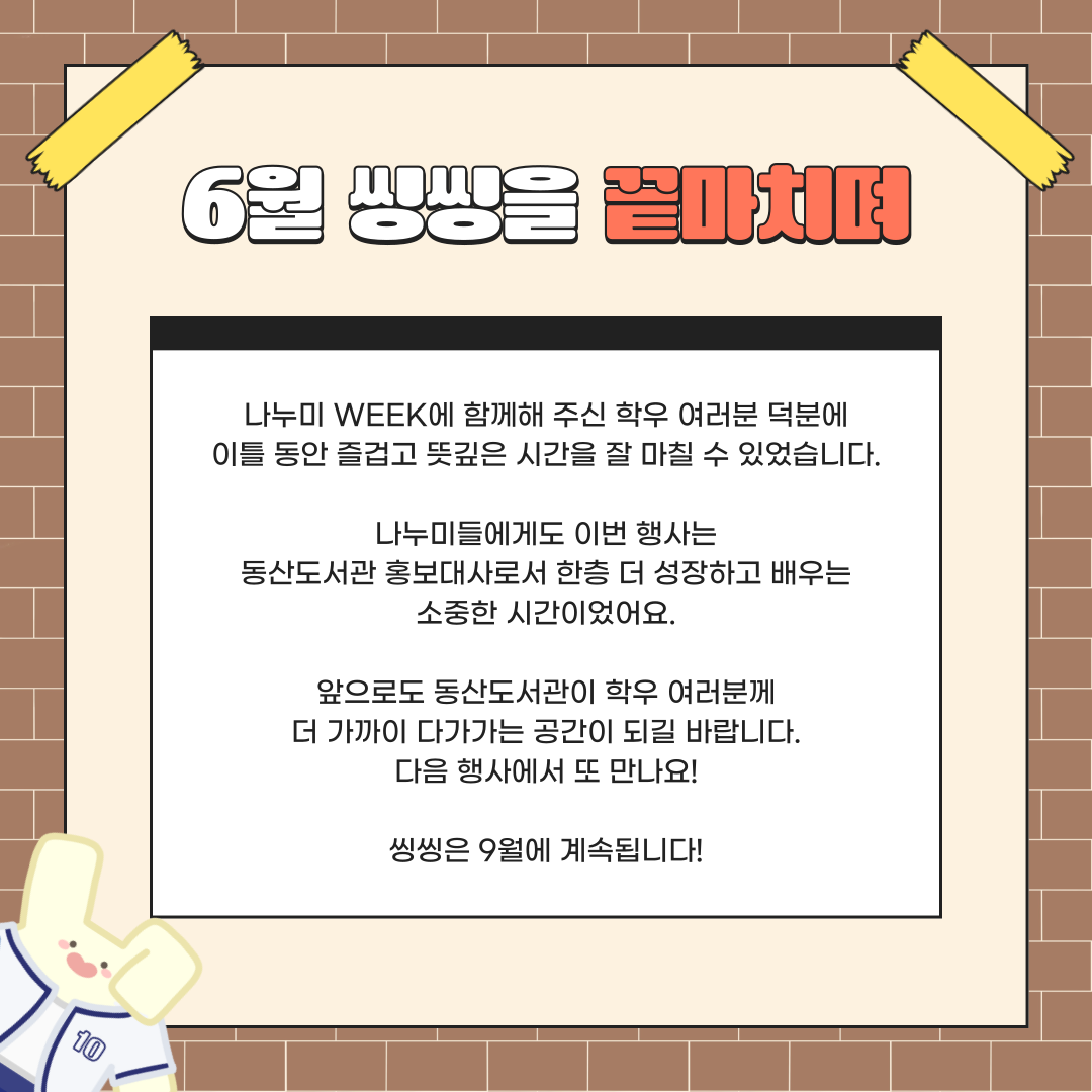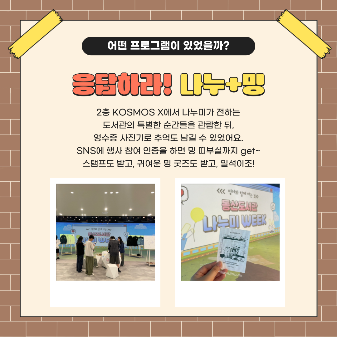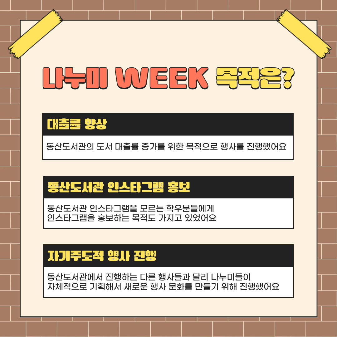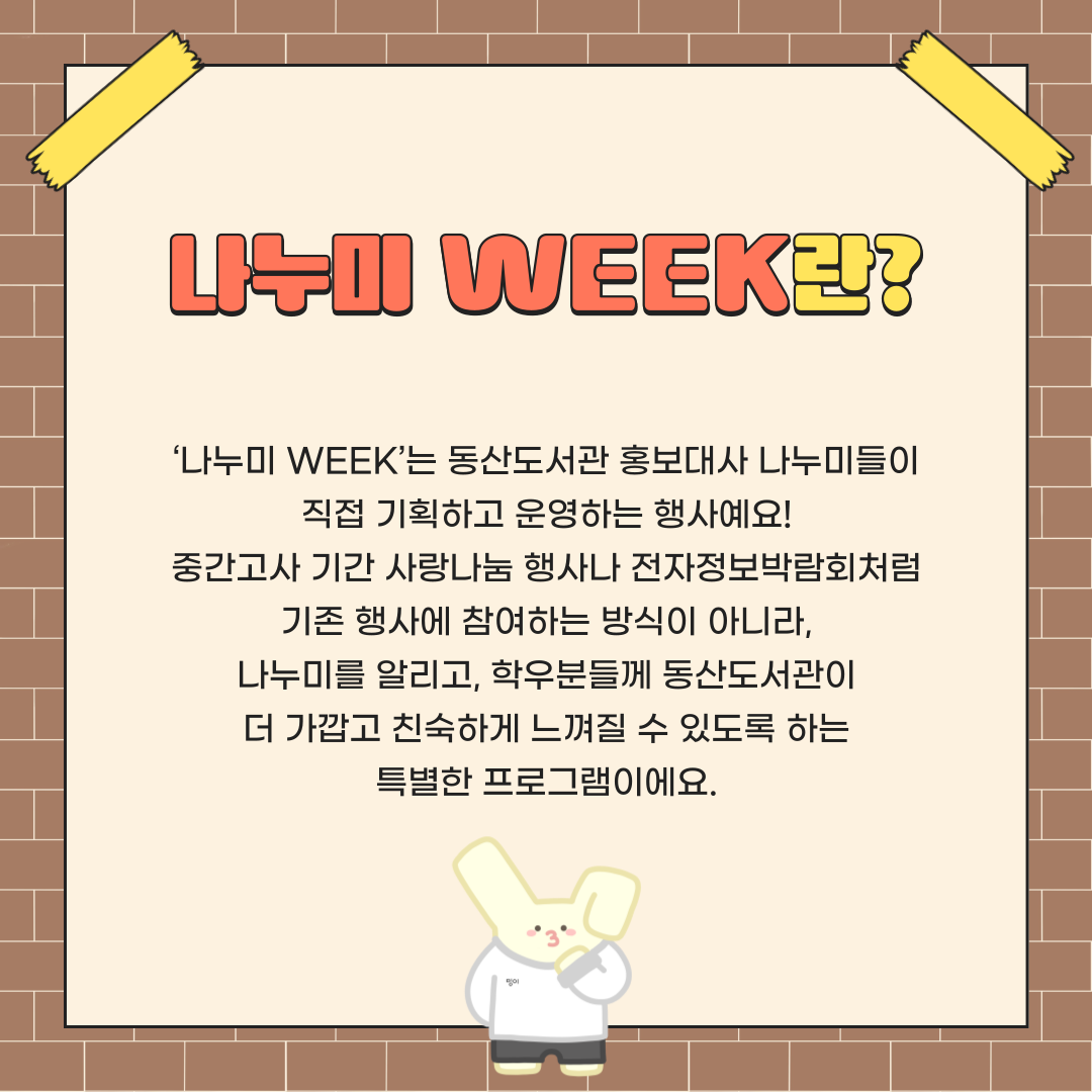 '나누미 WEEEK는 동산도서관 홍보대사인 나누미들이 직접 기획하고 운영하는 행사입니다. 기존에 참여하던 행사와 달리 나누미를 알리고 도서관 도서대출을 증가시키고 동산도서관인스타그램을 홍보하는 목적도 있습니다.
